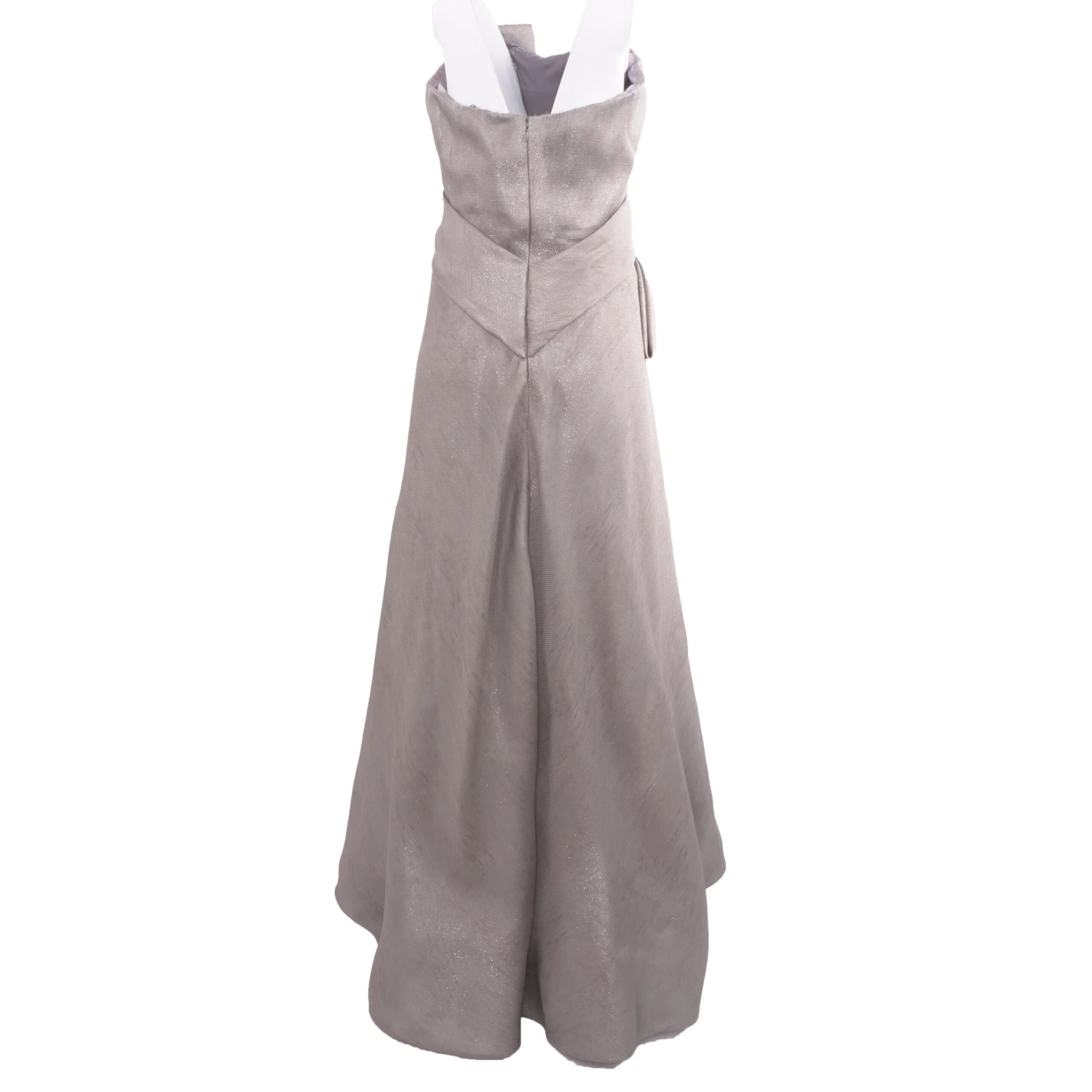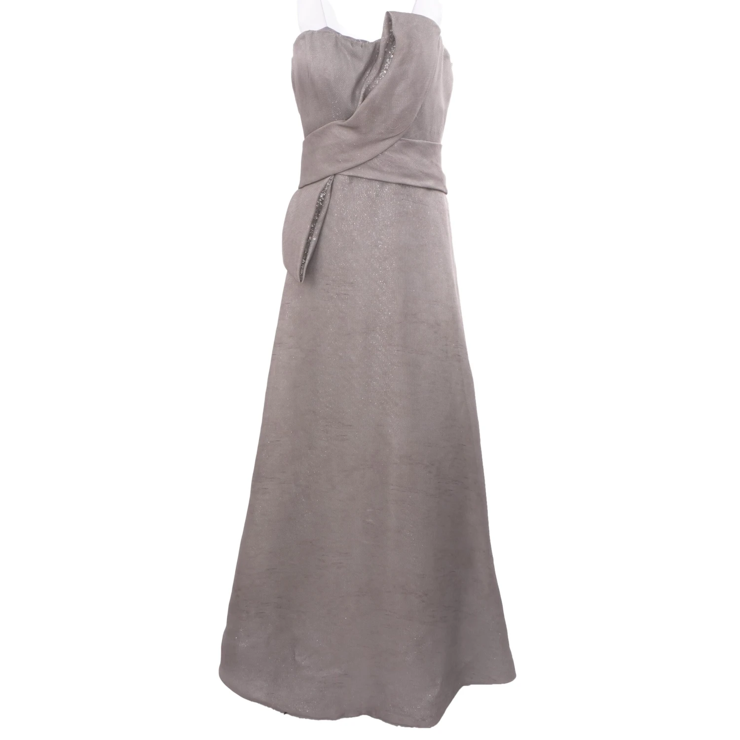 This dress from Rene Ruiz is the perfect bridesmaid gown, featured in a metallic gray fabric with a faux wrap front. Made in the U.S.A.